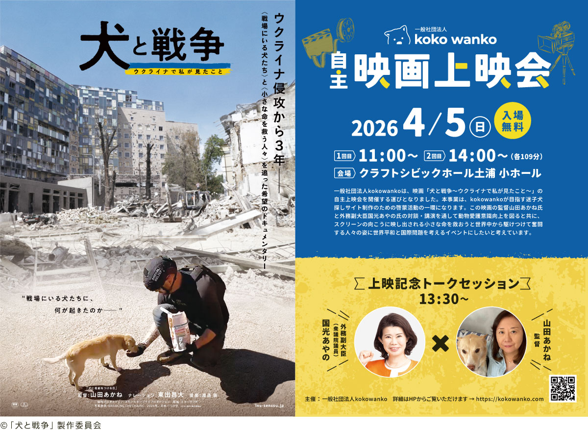 一般社団法人kokowankoは、ドキュメンタリー映画「犬と戦争~ウクライナで私が見たこと~」自主上映会を開催する運びとなりました。