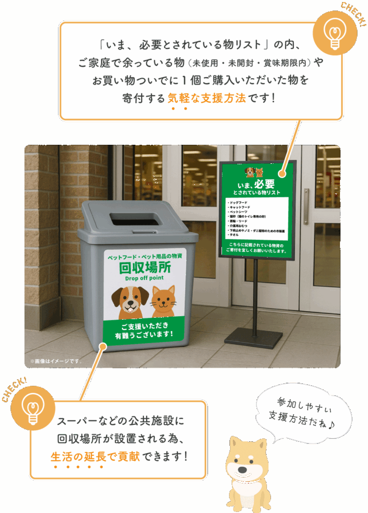 ※ご家庭や企業で余っている未使用・未開封・賞味期限内のペット食品やペット用品もOKです。